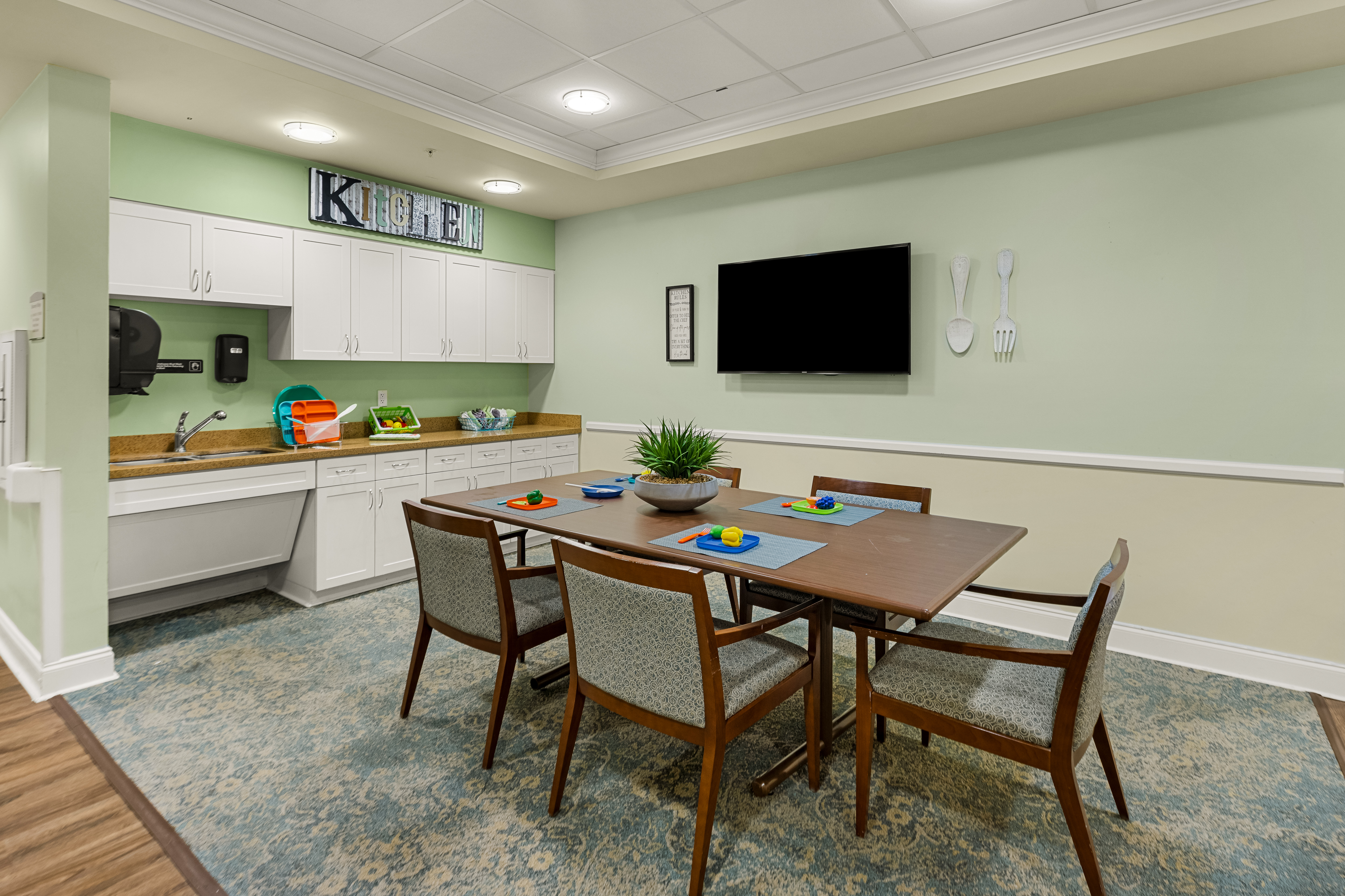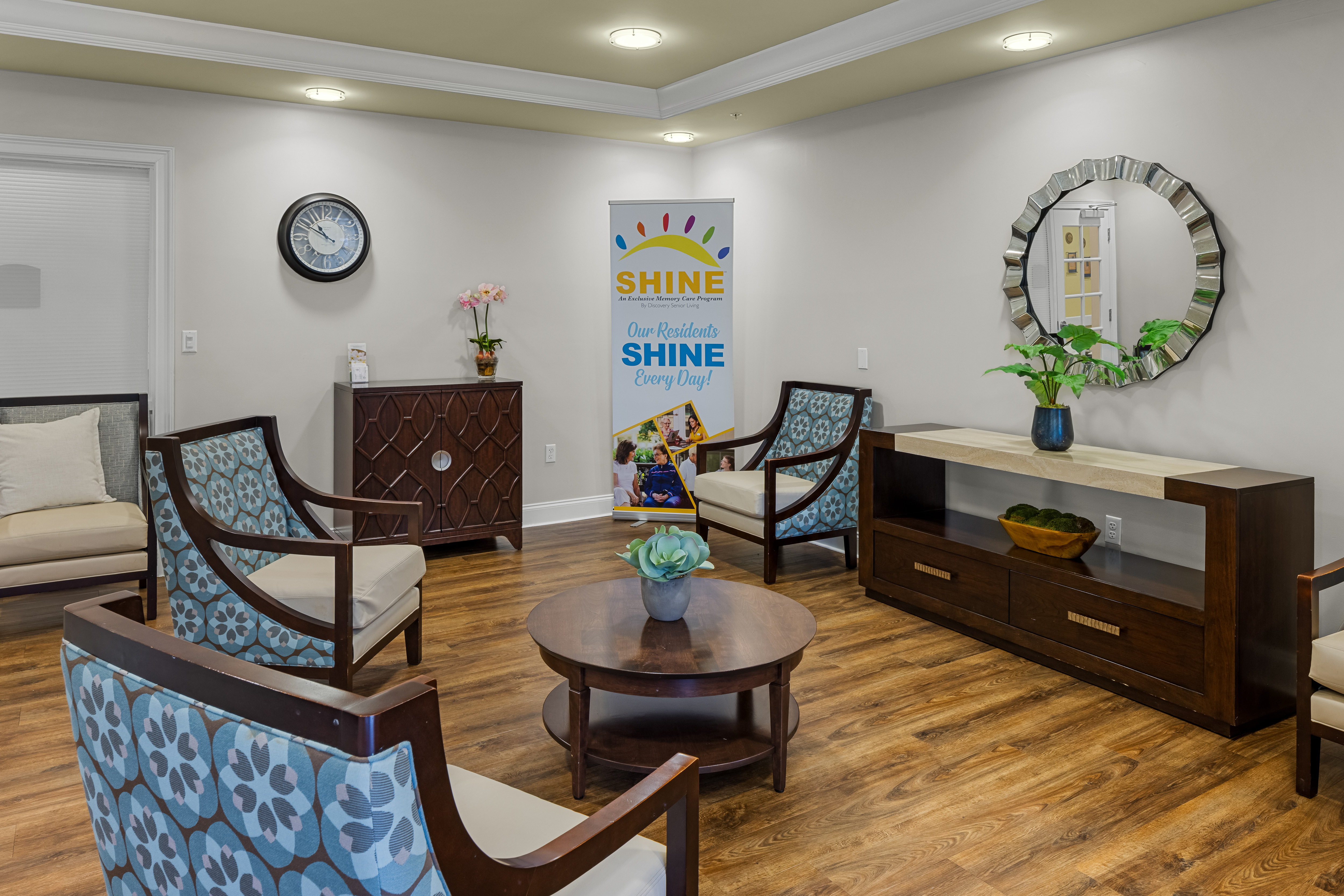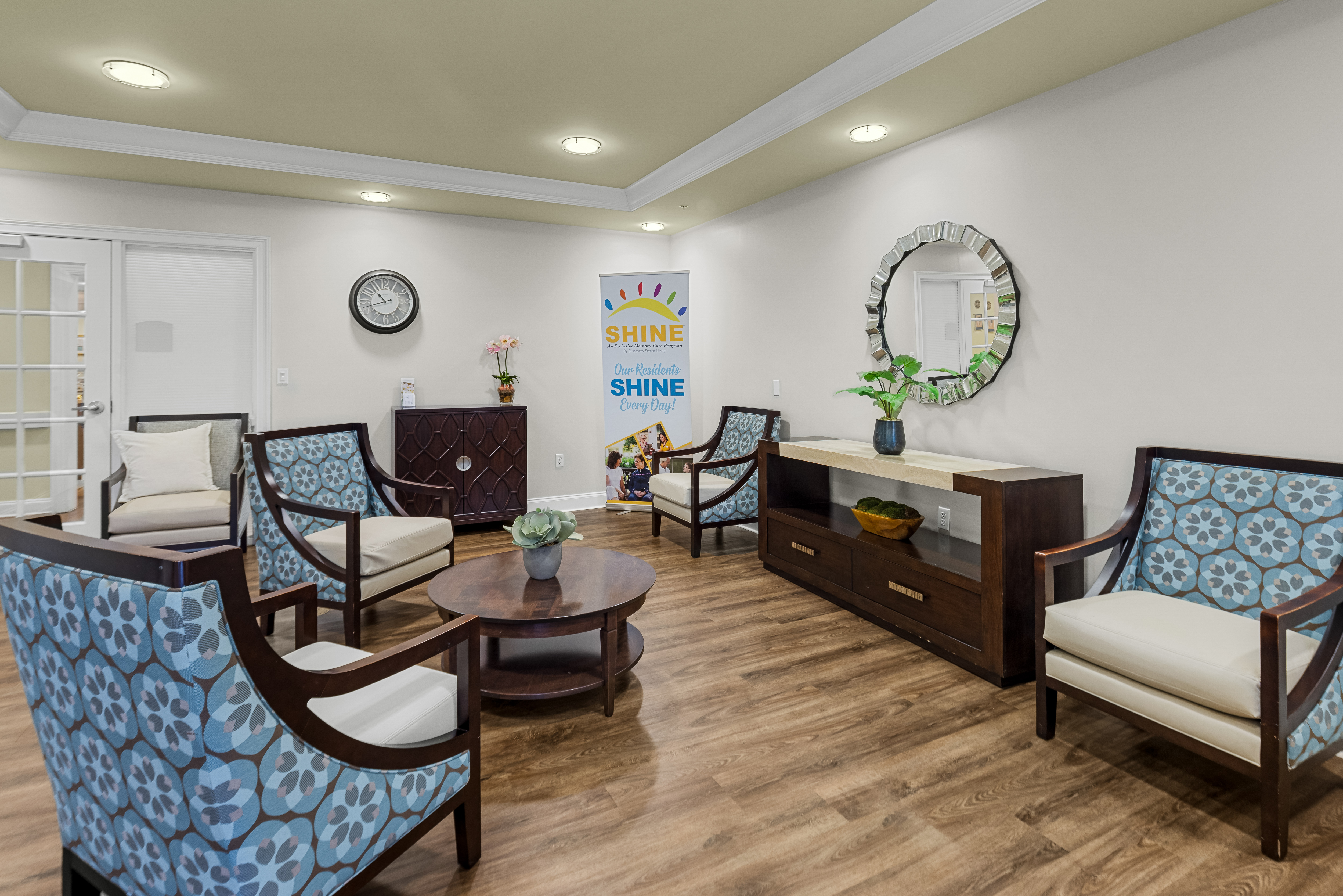 Our SHINE® Memory Care communities are designed to create a safe and uplifting space where residents can feel confident and independent. Our program incorporates soothing colors and music, defined spaces for living, dining, and entertainment, visual and tactile art, and aromatherapy to activate and engage the five senses to create meaningful experiences and enhance memory recall and emotional connection. These purposeful details help bring out residents’ smiles, spark their inner vitality, and foster a brighter, more fulfilling daily experience.